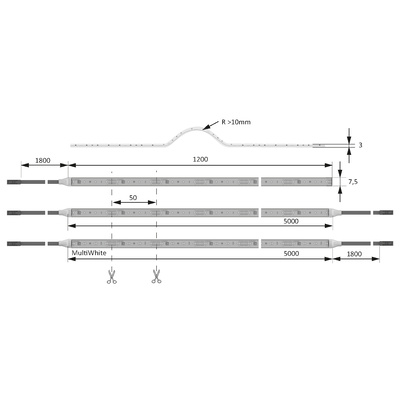 - Lead on both sides for the 5000 mm length (one cut, two lights), see drawing
