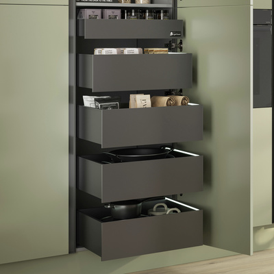 A ready-to-use drawer pack of AvanTech YOU drawers, stunningly accentuated with AvanTech YOU Illumination design profiles. The illuminated profiles are clipped onto the drawer sides, the battery holder is attached to the back panel hassle-free - and simply removed for recharging. That's all there is to it!