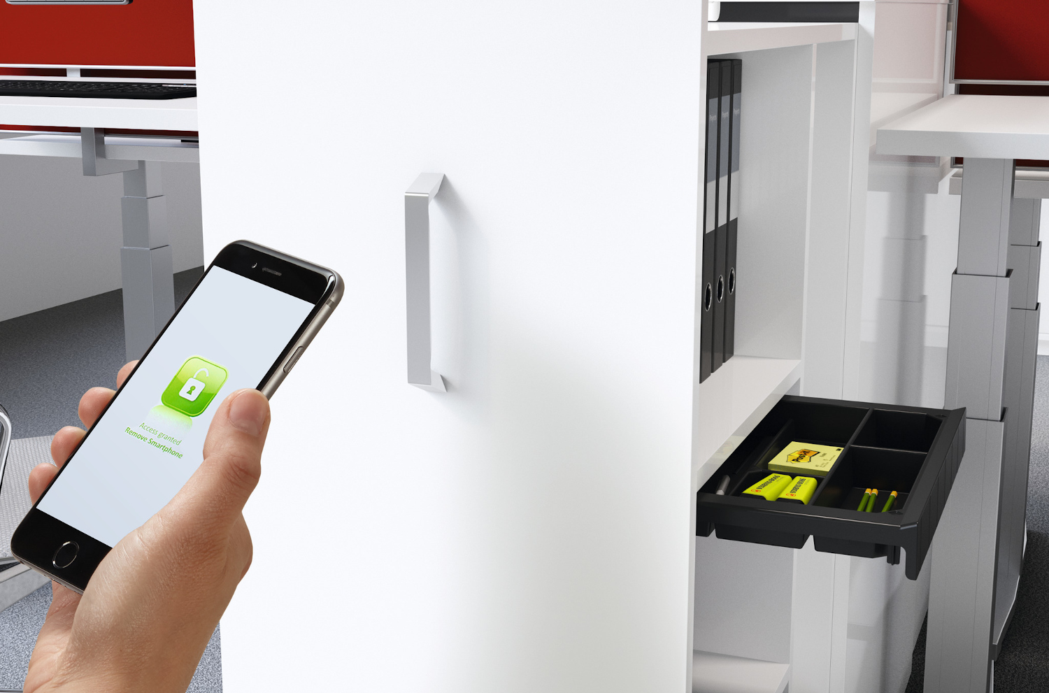 Unlocking, locking and managing the intelligent way: today, storage is managed without keys, easily and intuitively with the free XLOCK smartphone app. User management and remote unlocking is now possible online from anywhere in the world. For needs based "desk sharing" too, lock settings, user rights and groups are controlled with effortless ease and office storage spaces can be booked with extreme flexibility. Battery operated, the Hettlock Bluetooth locks are wireless and can be positioned wherever chosen – this simplifies furniture construction and provides greater creative flexibility in planning spaces.